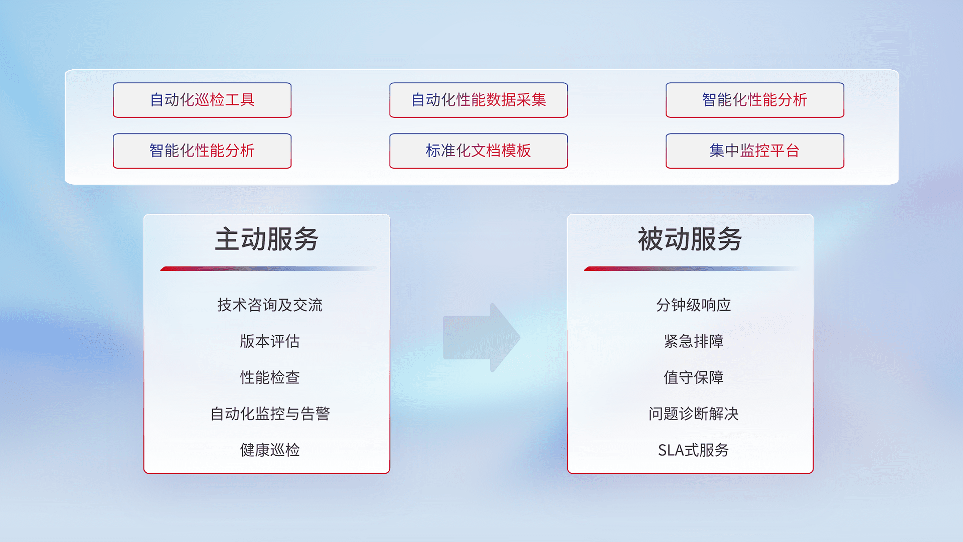 智能化工具和标准化文档,,,,保障服务质量,,,提供主动服务(包含技术咨询、、、、版本评估、、、、性能检查、、、自动化监控与告警、、、、健康巡检)和被动服务包含(分钟级响应、、紧急排障、、、、值守保障、、、问题诊断解决、、、、SLA服务)。。